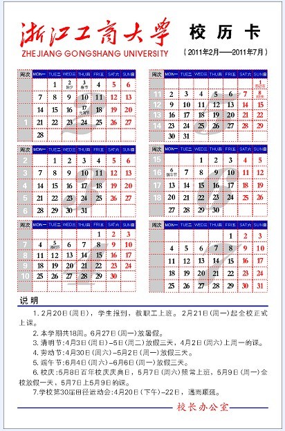 2010-2011学年第二学期校历卡